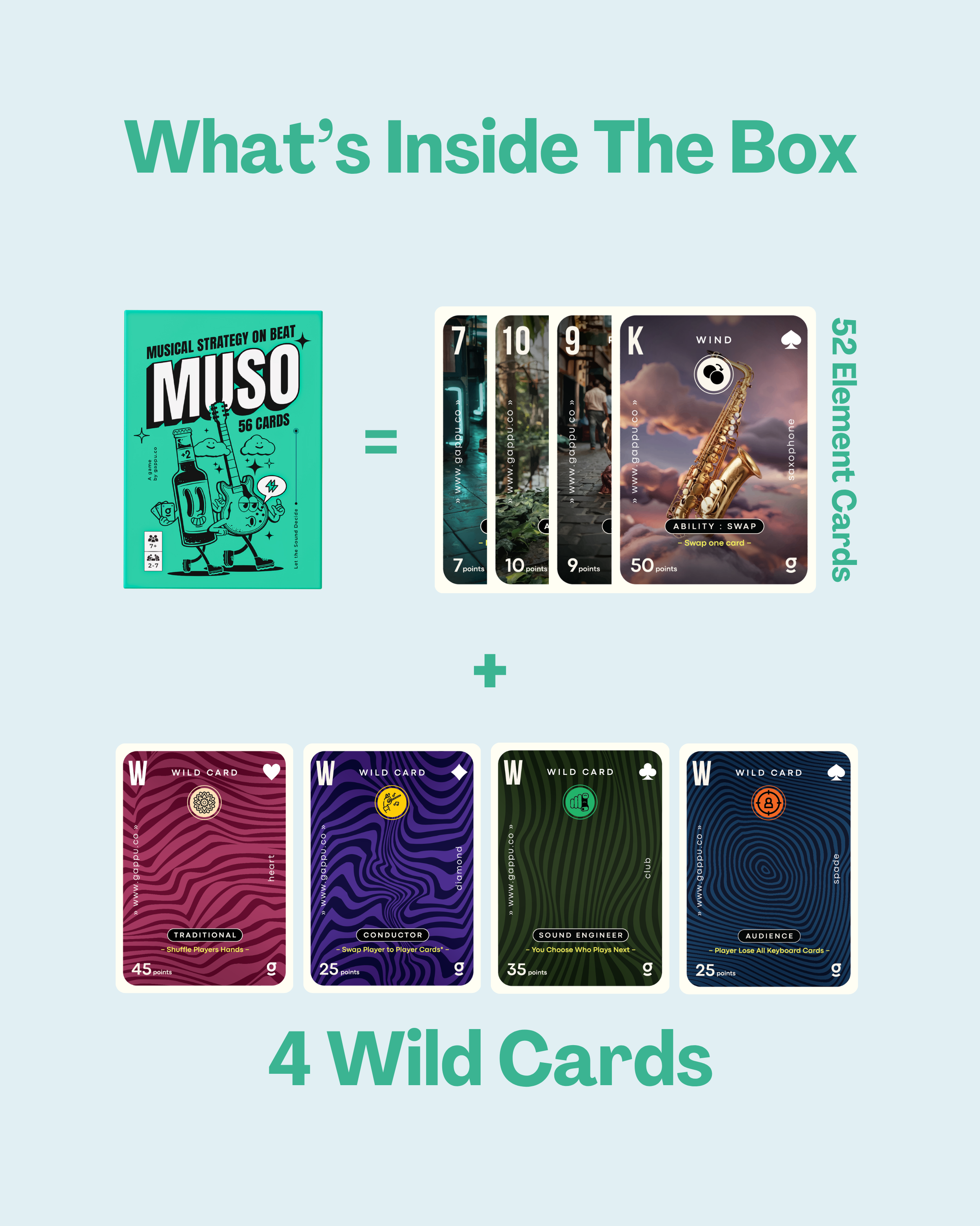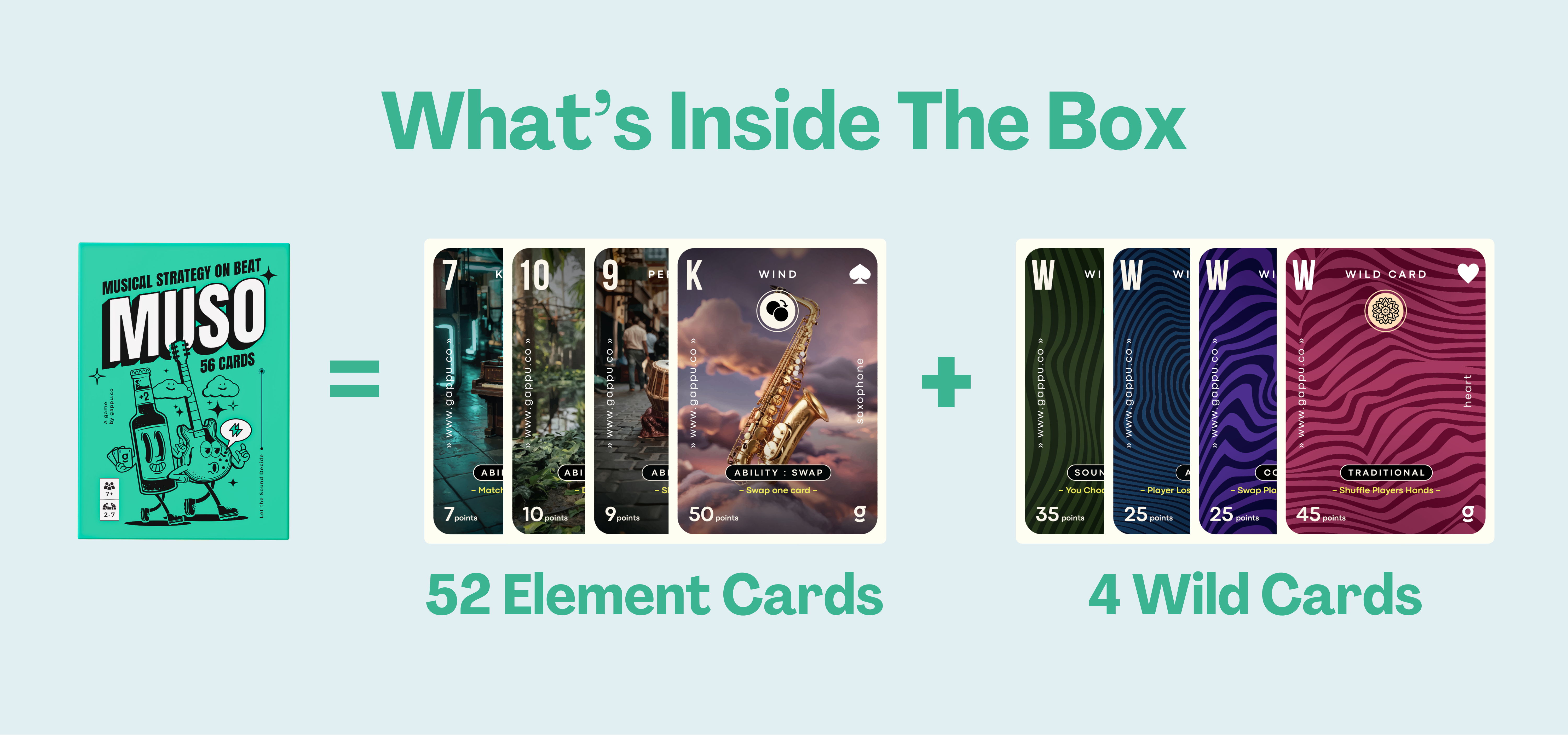 MUSO is a fast-paced, points-based music card game where players use instrument abilities, wild cards, and combos to outscore or knock out opponents strategically.